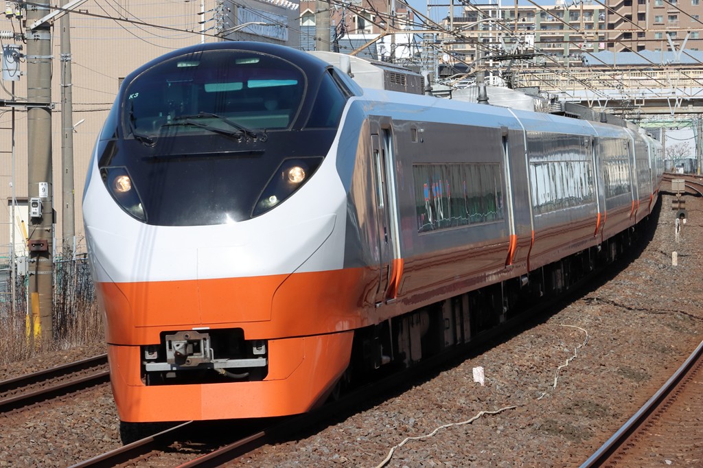 カツK3編成の塗装変更後の姿。2023年に茨城デスティネーションキャンペーンを記念して、E653系の塗装が採用された。車体下部の塗装はオレンジパーシモンである。現在もこの姿で使用されている。
