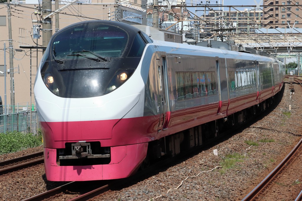 カツK12編成の塗装変更後の姿。2023年に茨城デスティネーションキャンペーンを記念して、E653系の塗装が採用された。車体下部の塗装はスカーレットブロッサムである。2025年に標準色に復元され、この姿は消滅した。