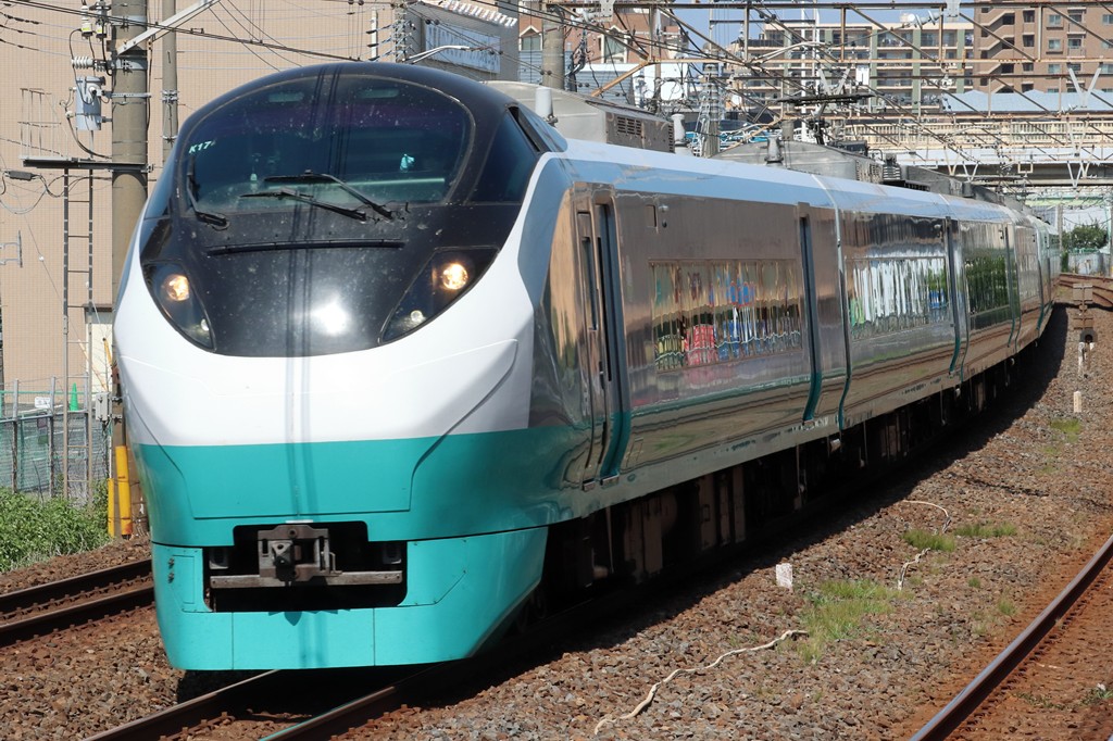 カツK17編成の塗装変更後の姿。2022年に茨城デスティネーションキャンペーンを記念して、E653系の塗装が採用された。車体下部の塗装はグリーンレイクである。2025年に標準色に復元され、この姿は消滅した。