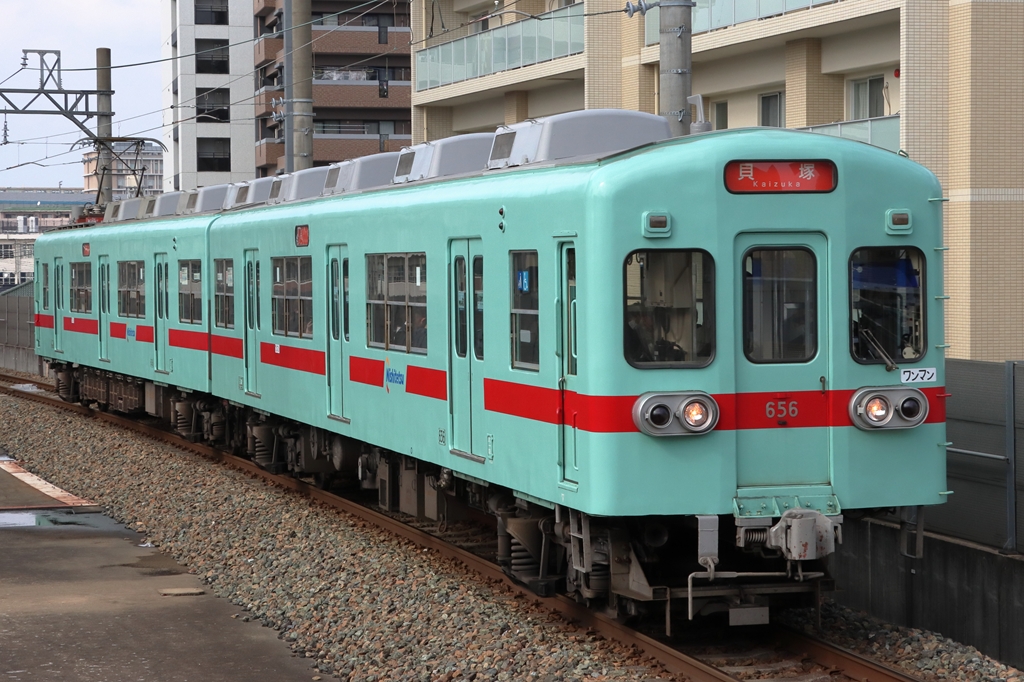 貝塚線の606Fの姿。2025年にアイスグリーン色の復刻塗装が施された。現在もこの姿で使用されている。