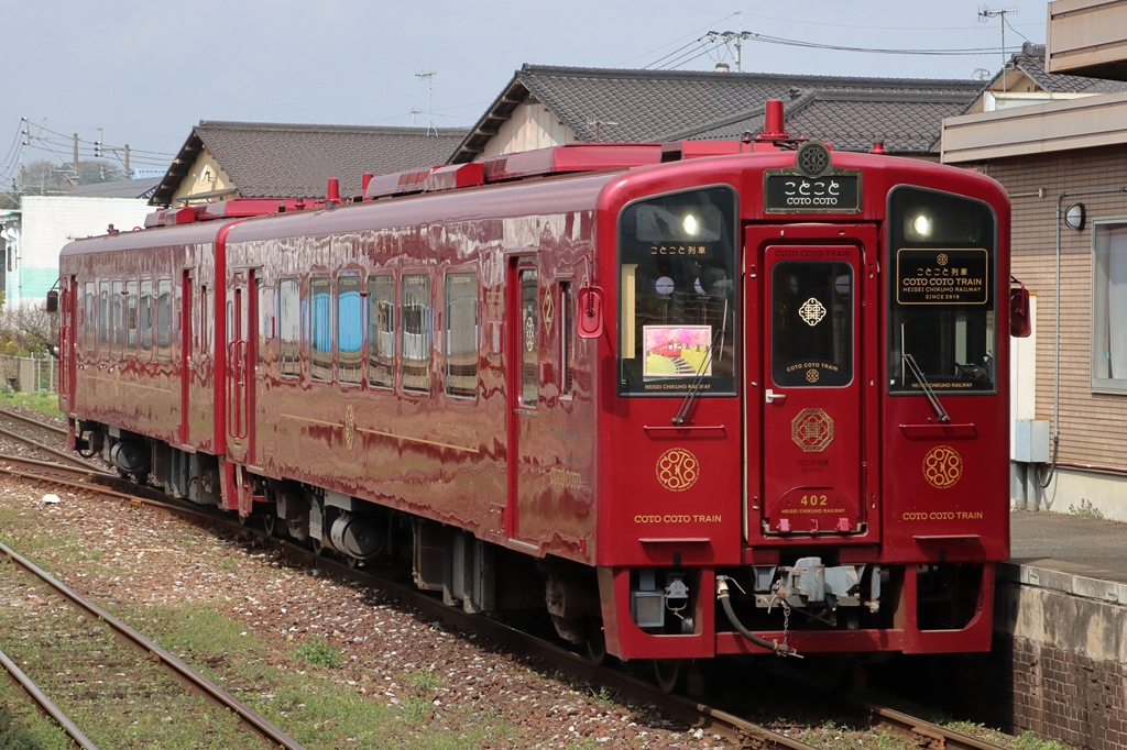 401・402の改装後の姿。2019年に観光列車「ことこと列車」の専用車両として、内外装が更新された。現在はこの姿で使用されている。